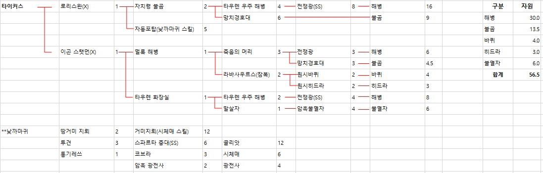 [타이커스 조합표, 필요 자원량]